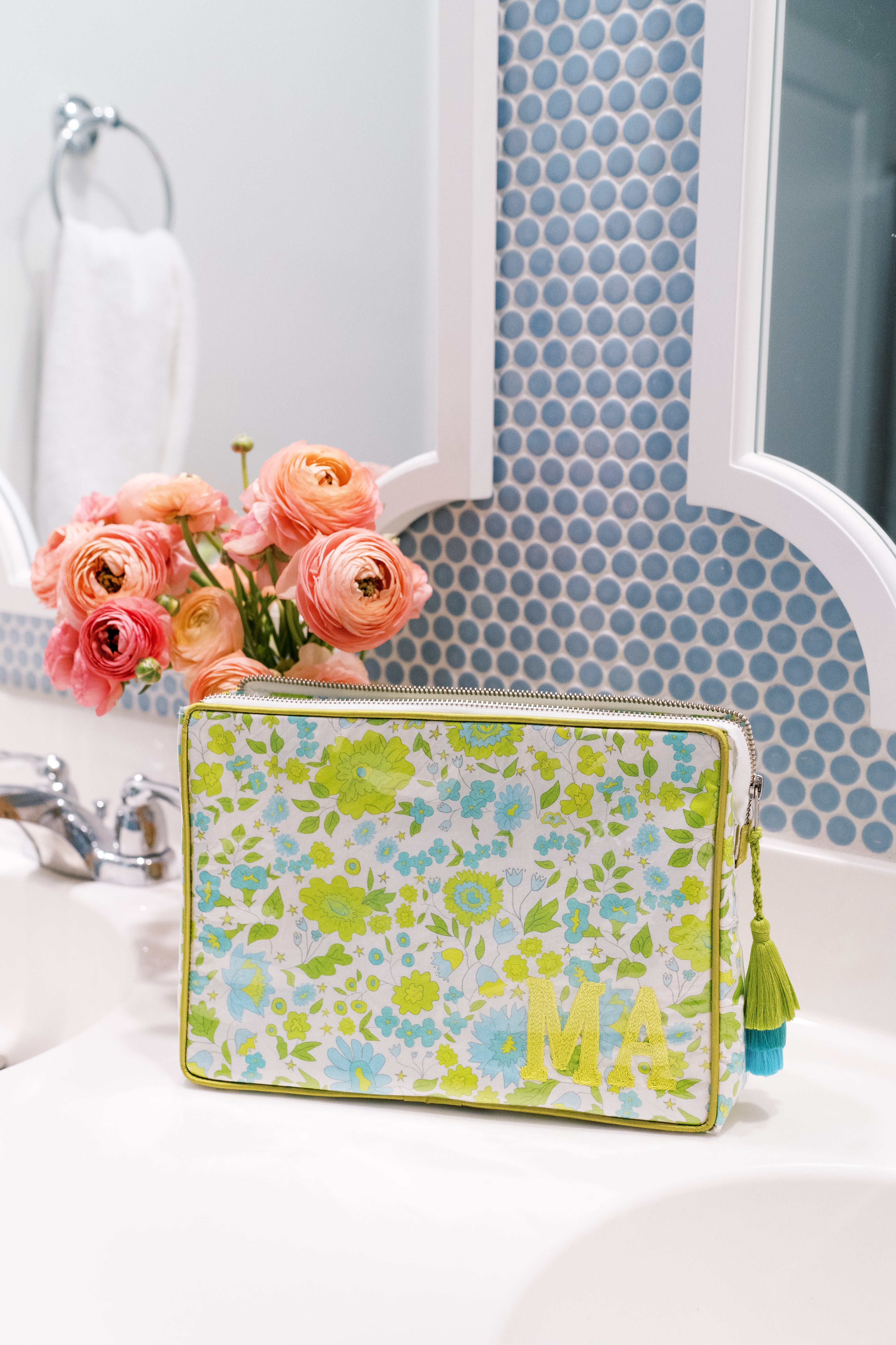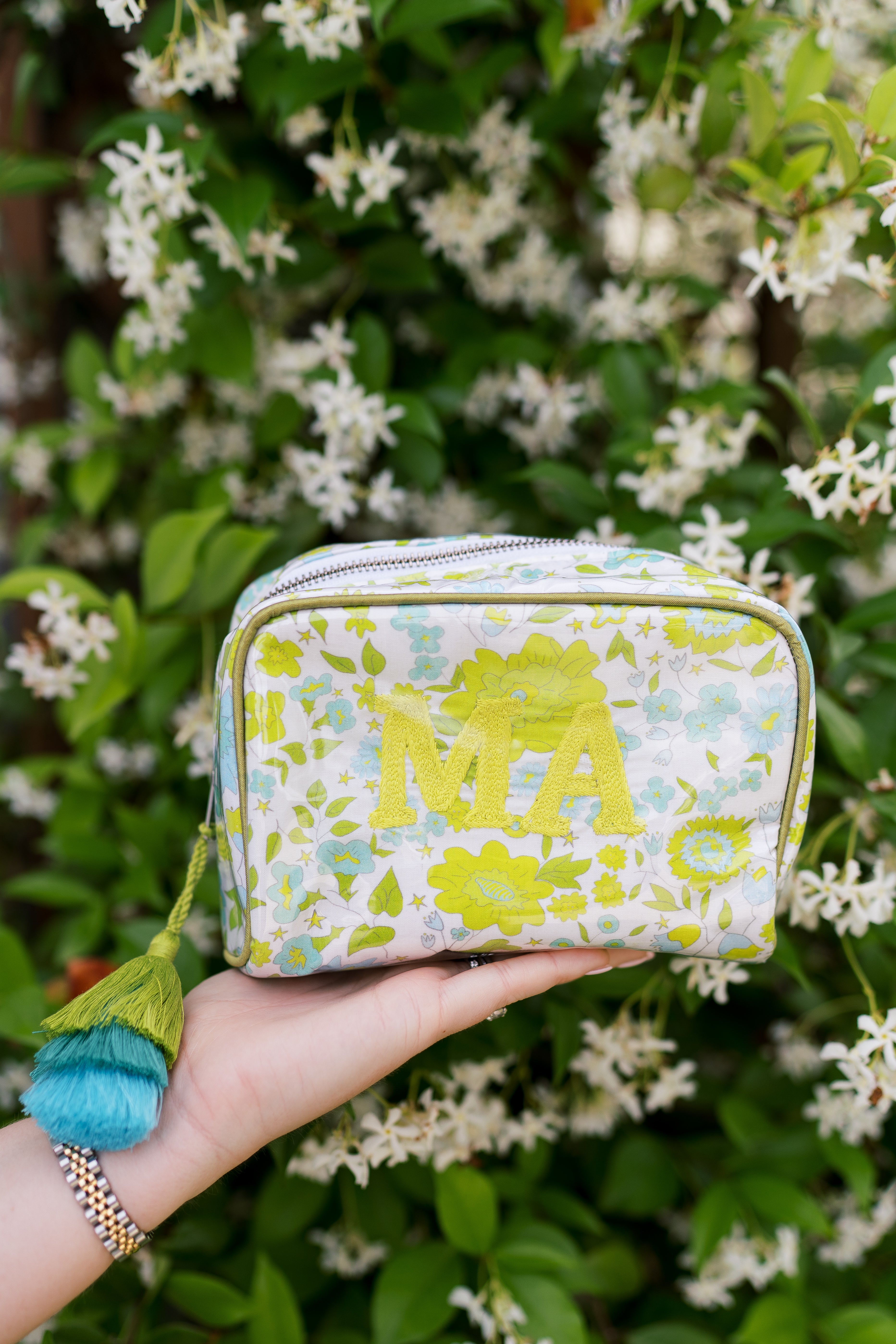 From cutting blocks and printing the fabric to templating each individual monogram and stitching by hand, then sewing them together with vinyl on the outside … they are as functional as they are cute! Perfect for cosmetics, baby gear, electronics and more!